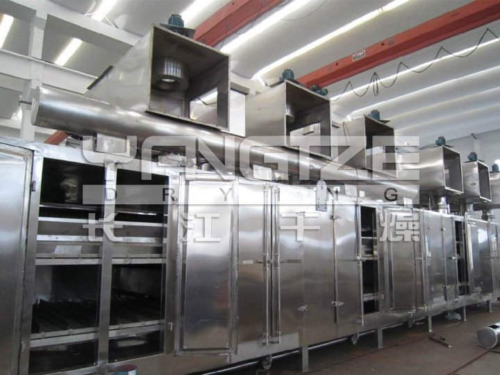The belt drier is continuous drying equipment in batch. It is suitable for drying the raw materials that is in the shape of piece, s trip or granule and is good in permeability. Particularly it is suitable for such raw materials that contain high moisture and are not permitted high temperature for example, dehydrated vegetable,catalyst, drinking tablet of Chinese traditional medicine. Its features are fast in drying speed, strong in vaporization, good in quality of products. Typical products Dehydrated vegetable, granule feed, monosodium glutamate, check extraction, organic pigment, synthetic rubber, propylene fiber, medicine, medical material, small wooden products, plastic products, aging or solidifying for electronic elements. For pasted raw material such as filter cake, it can be dried after shaped through granulator or extruder.